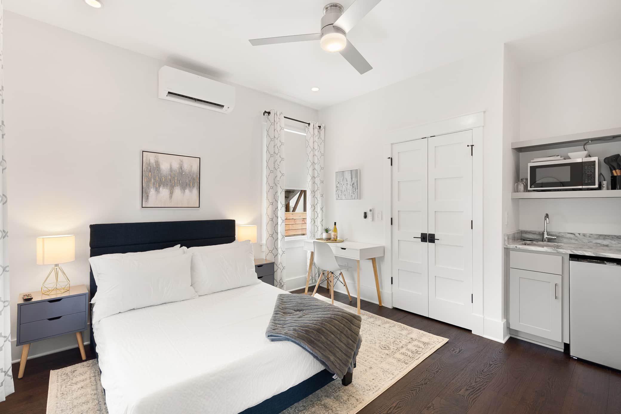 The Ashley Suite is appointed with high end furniture including premium plush bedding, hybrid mattress, and a 43" smart TV. The kitchenette includes quartzite countertops, sink, compact size refrigerator, microwave, two burner induction hot plate, Keurig coffee maker, essentials for light cooking, and service for 2. The full bathroom features a large walk-in tiled shower. The closet includes an organization system suited for long-term guests.