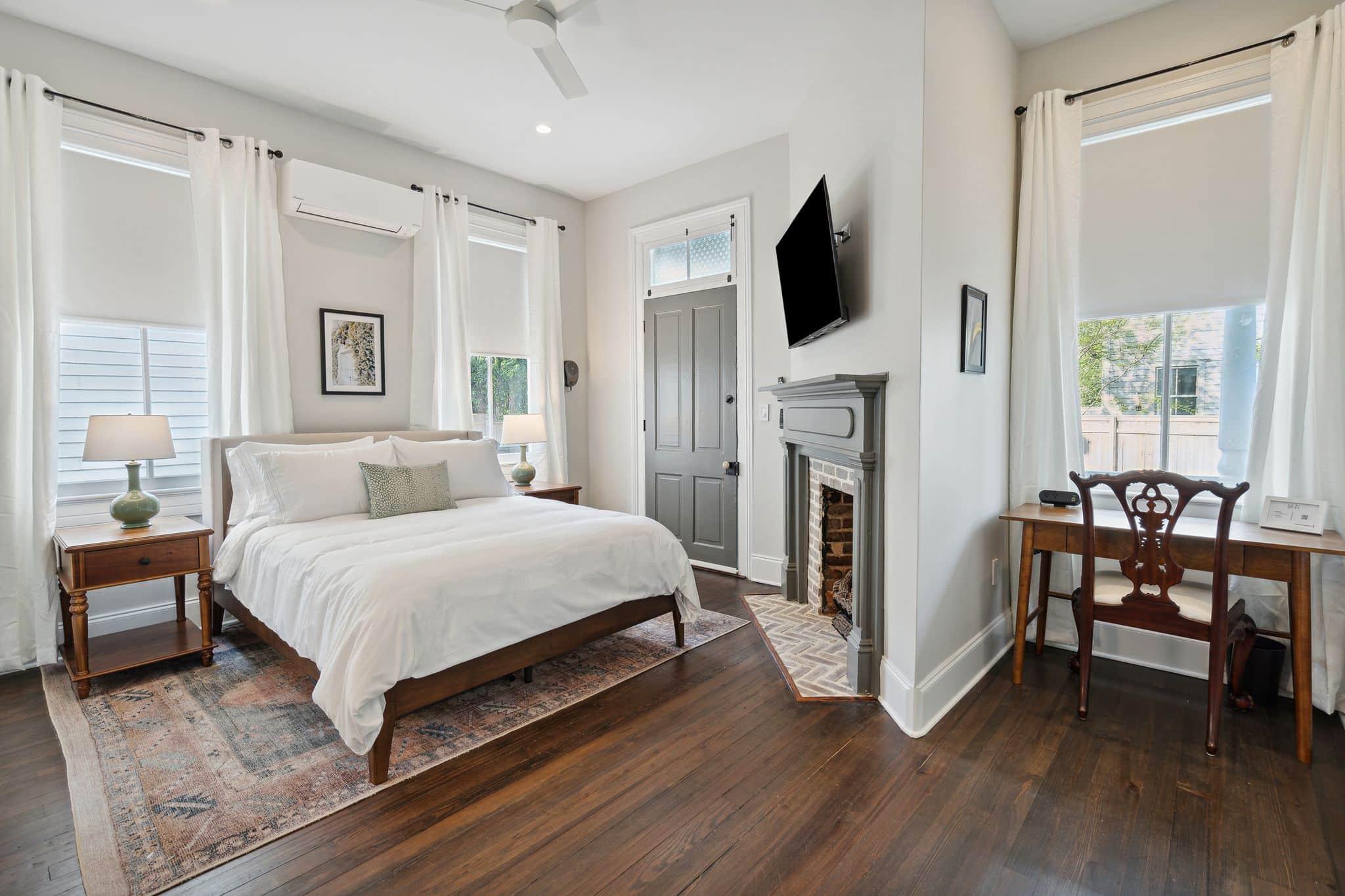 As soon as you step inside, you'll be greeted by the elegant architecture and Victorian details such as restored fireplaces, mantels, detailed trim, and original heart pine floors. The space has been thoughtfully designed to maintain its historical charm while offering modern amenities to ensure a comfortable and relaxing stay.
